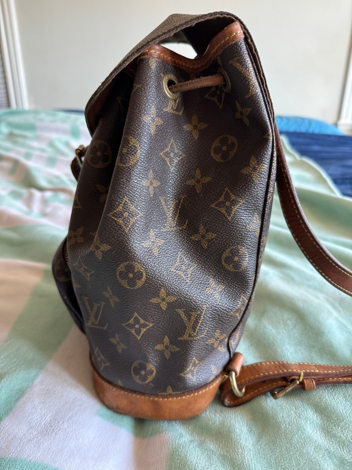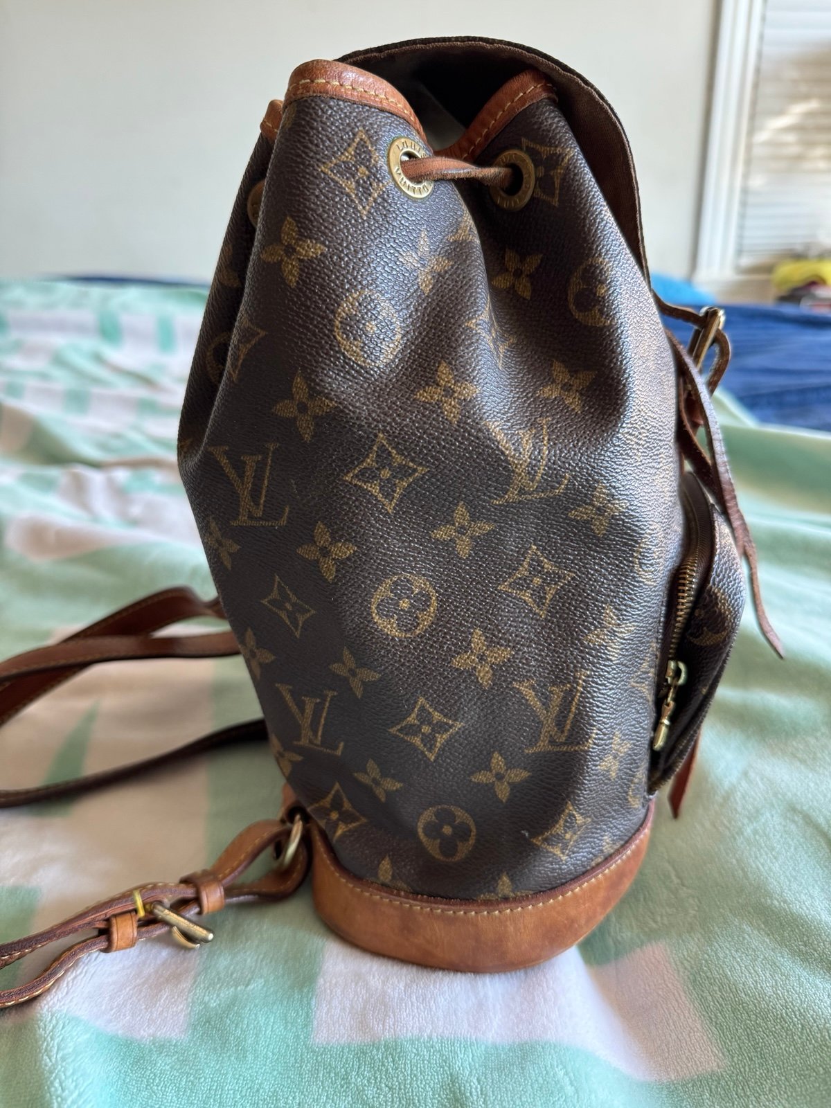 I’m the second owner of this gorgeous and luxurious LV medium size backpack. Great for travel or everyday use. Normal wear with a few water marks and rubbing on the leather. Original hardware with original leather tie closure. Top leather trim around bucket shows no signs of cracking.